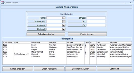 Das Selektionsergebnis kann auch im Excel-Format exportiert oder an das integrierte Etikettedruckprogramm übergeben werden. So können z.B. Serienbriefe oder umfangreiche Auswertungen erstellt werden. |