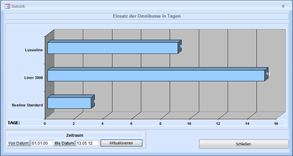 In der statistischen Auswertung kann die Auslastung der Omnibusse insgesamt oder auf einen bestimmten Zeitraum beschränkt auf einem Blick erkannt werden.